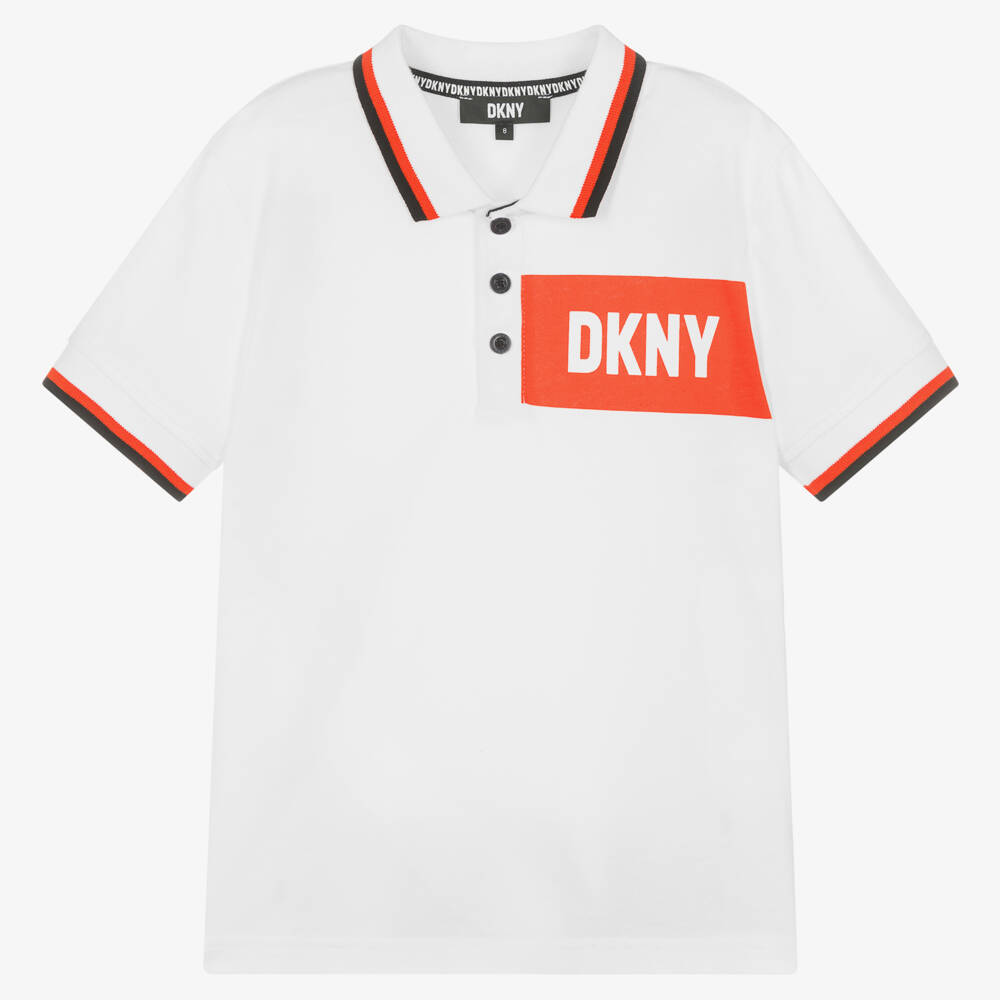From iconic American brand DKNY, this teen boys white polo shirt is made from soft cotton jersey. It has a red box logo print on the front and a large black print on the back along the hemline. A classic polo style, it has a button-up collar and ribbed black and red trims.