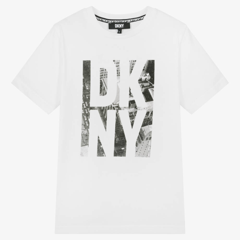 A casual white T-shirt for teen boys by DKNY, with a stacked logo on the front against a contrast black and white New York graphic print. Made in soft cotton jersey, this regular fit tee has short sleeves and a classic crew neck for added comfort.