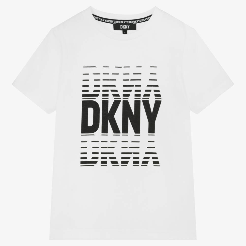 Stylish white T-shirt for teen boys by DKNY, made in soft cotton jersey. It has a cool black logo print on the front in a unique mirrored style.