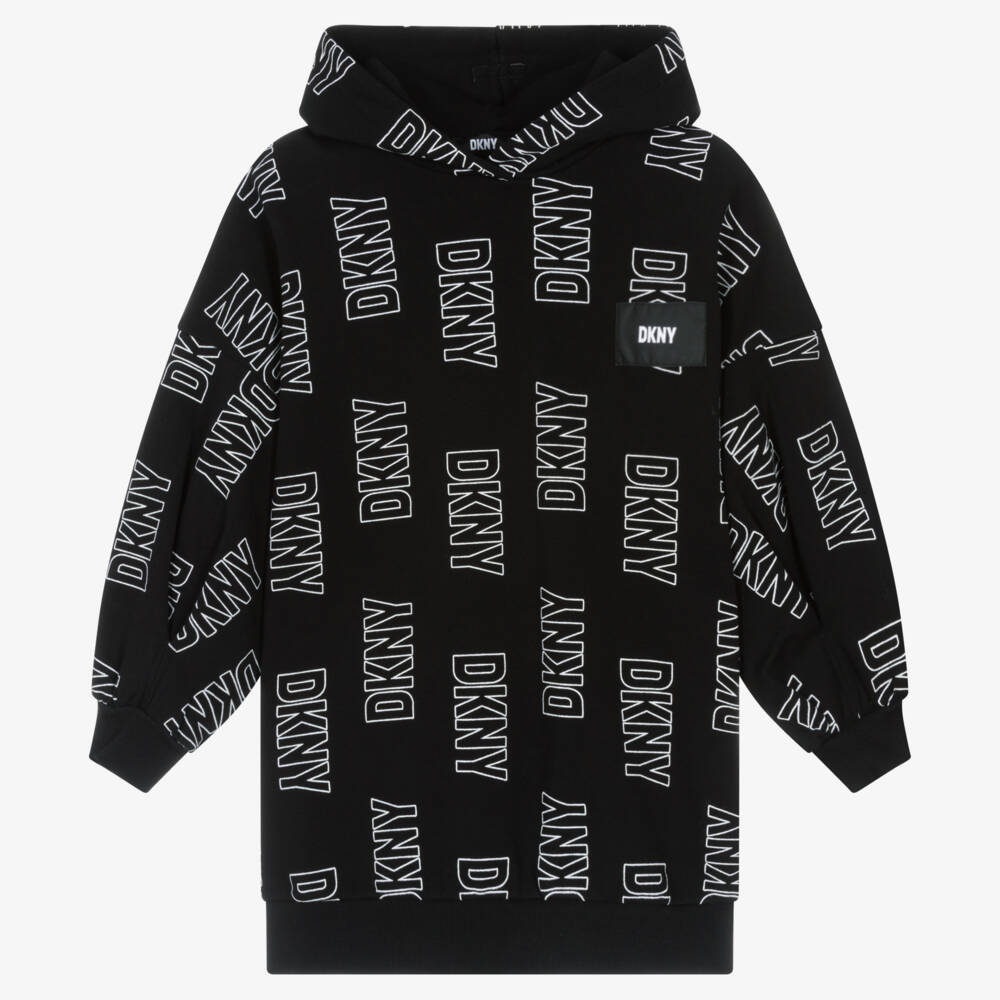 Edgy black cotton hoodie dress for teen girls by DKNY. Made in stretchy, mid-weight jersey, bold white branding decorates the fabric for a statement look. Cool and casual, it has dropped shoulders, full balloon-style sleeves and softly ribbed trims for comfort and shape. A silky black logo patch on the front and a rubber label on the hood complete the branded look.