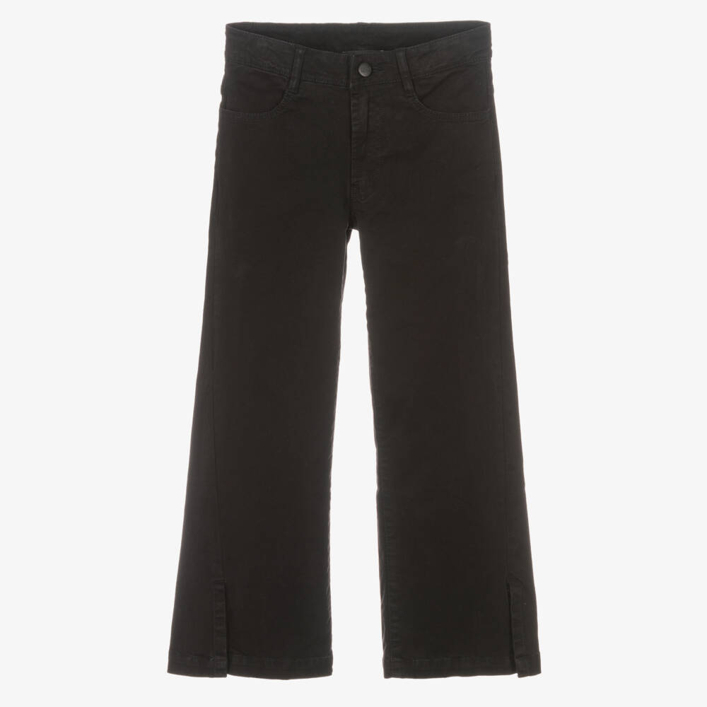 Stylish black flared jeans for teen girls by DKNY, made in smooth cotton twill. With a logo badge stitched on to the back pocket, these trousers fasten with a button and zip fastening, with four useful pockets.