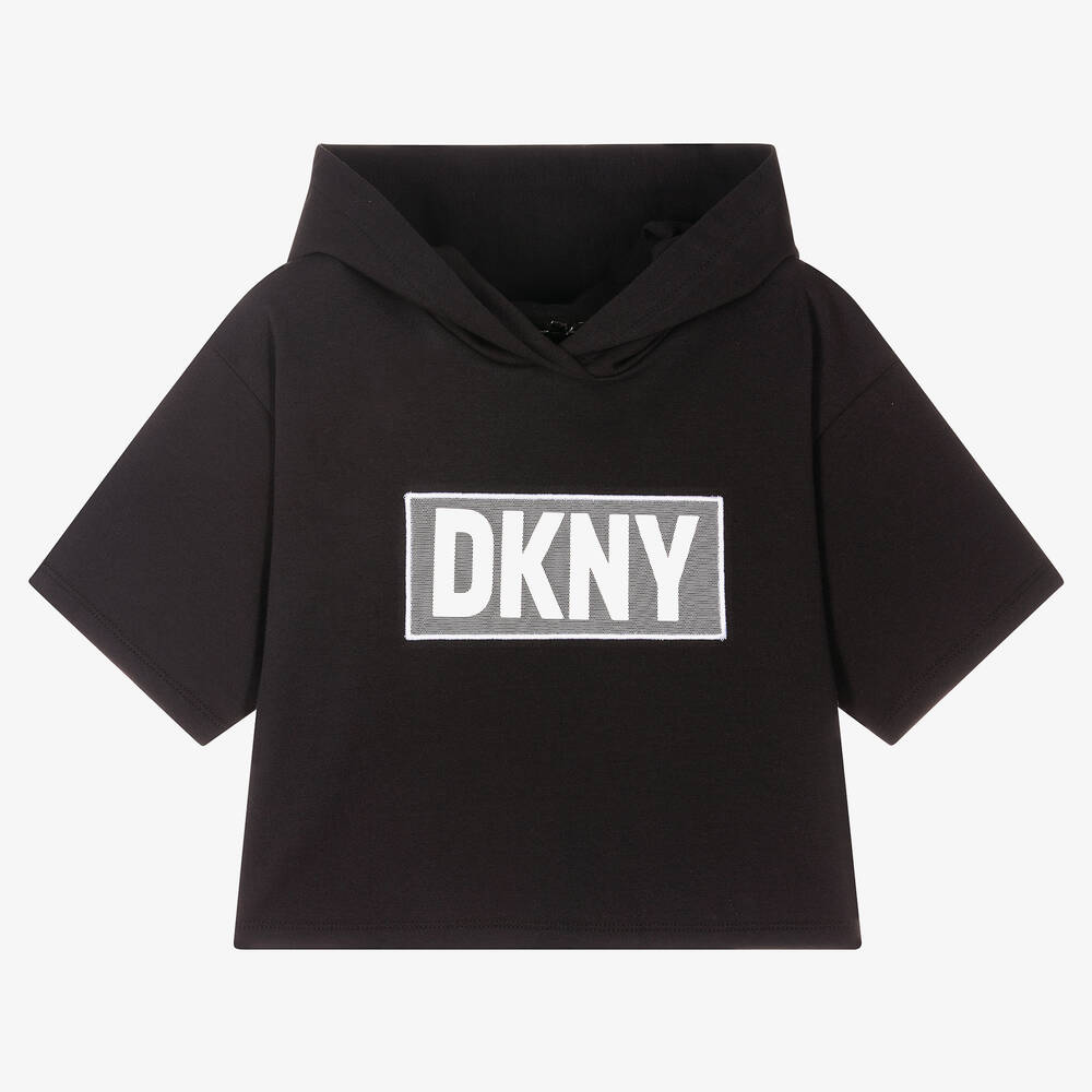Black hooded T-shirt for teen girls by American brand DKNY, with a flocked white logo on a tulle panel. It is made in soft, lightweight cotton jersey.
