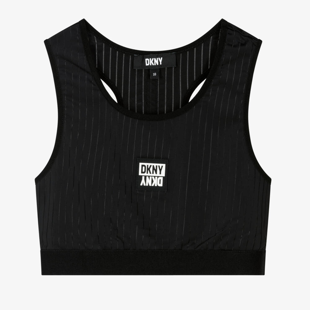 Black sports top for teen girls by DKNY, instantly recognisable with a black and white logo print on the chest. Silky smooth and stretchy, this striped cropped top has a racer back with black and white branding down the middle. Ideal for sports, it has cut out detailing above the elasticated hem.