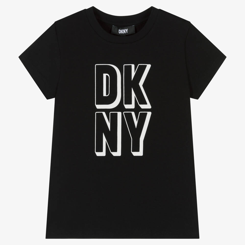 Logo-inspired black T-shirt for teen girls by DKNY, in a slim fit. A graphic twist on a wardrobe essential, it has a bold white logo print on the front and capped sleeves.