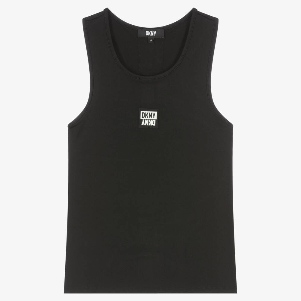 From DKNY, sporty black vest top for teen girls with a rubberised logo patch on the front. Beautifully styled with a round neckline and open racerback, this timelessly cool top is finished with logo tape on the back for an added designer touch. Silky soft and stretchy, it is ideal for active days or layering.