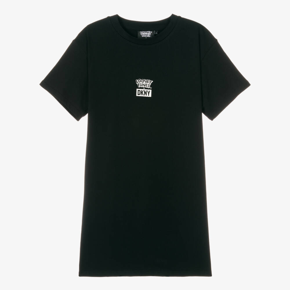 Cartoon-inspired black T-shirt dress for teen girls, with a Looney Tunes x DKNY logo print on the front to mark the collaboration. Cool and casual, it has an oversized Daffy Duck character print with the iconic phrase 'That's All Folks!' on the back for a graphic finish. Fun yet comfortable, it is made in super soft organic cotton jersey.