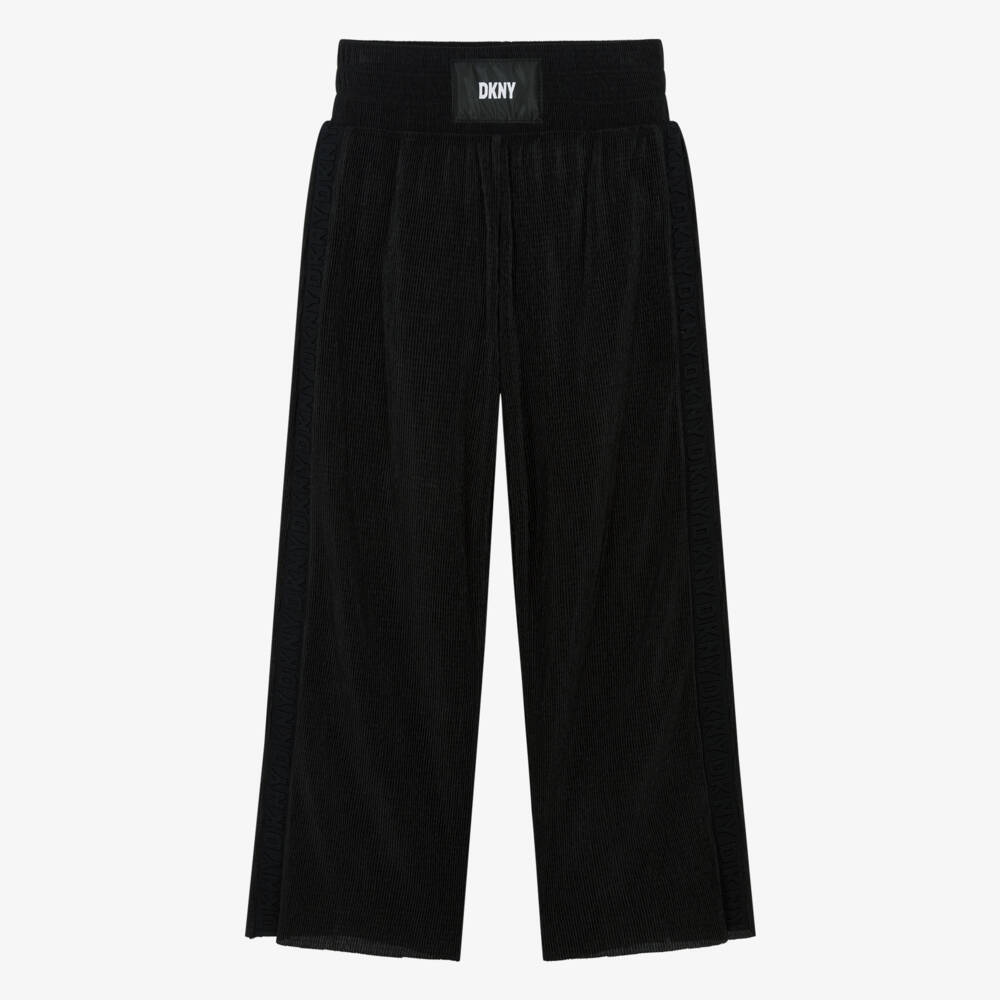 Stylish black trousers for teen girls by DKNY, complete with jacquard logo tape on the legs. In soft ribbed fabric, these wide-leg trousers are easily paired with a tee for a modern, casual look. They have a wide, elasticated waistband for added comfort, with a black and white logo patch on the front.