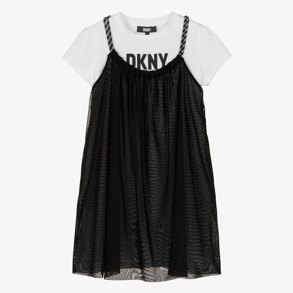 Black and white 2-in-1 dress for teen girls by DKNY. Girls can mix and match with the white stretchy T-shirt dress, cut for a slim fit with a distinctive black logo print on the chest. It is worn with a dress overlay in sheer black mesh, designed with a square logo patch on the back and drawstring cord shoulder straps.
