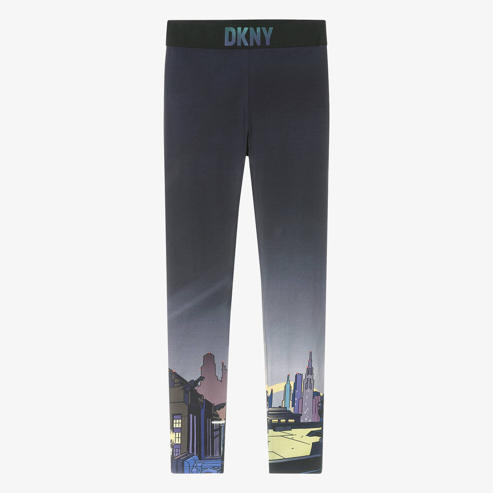 Bold and distinctive for teen girls, these dark blue cotton leggings are from streetwear brand DKNY. An iridescent logo stands out on the elasticated waistband and a Batman-inspired cityscape is patterned on the hems. The iconic yellow Batman x DKNY logo is featured on one ankle.