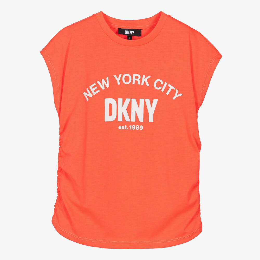 In neon coral orange-pink, this sleeveless T-shirt for teen girls by DKNY is sure to bring vibrant colours into the casual wardrobe. The bold white New York City DKNY logo adds contrast while the gently elasticated side seams are ruched for a feminine shape. This fitted tee is made in a soft cotton blend jersey.