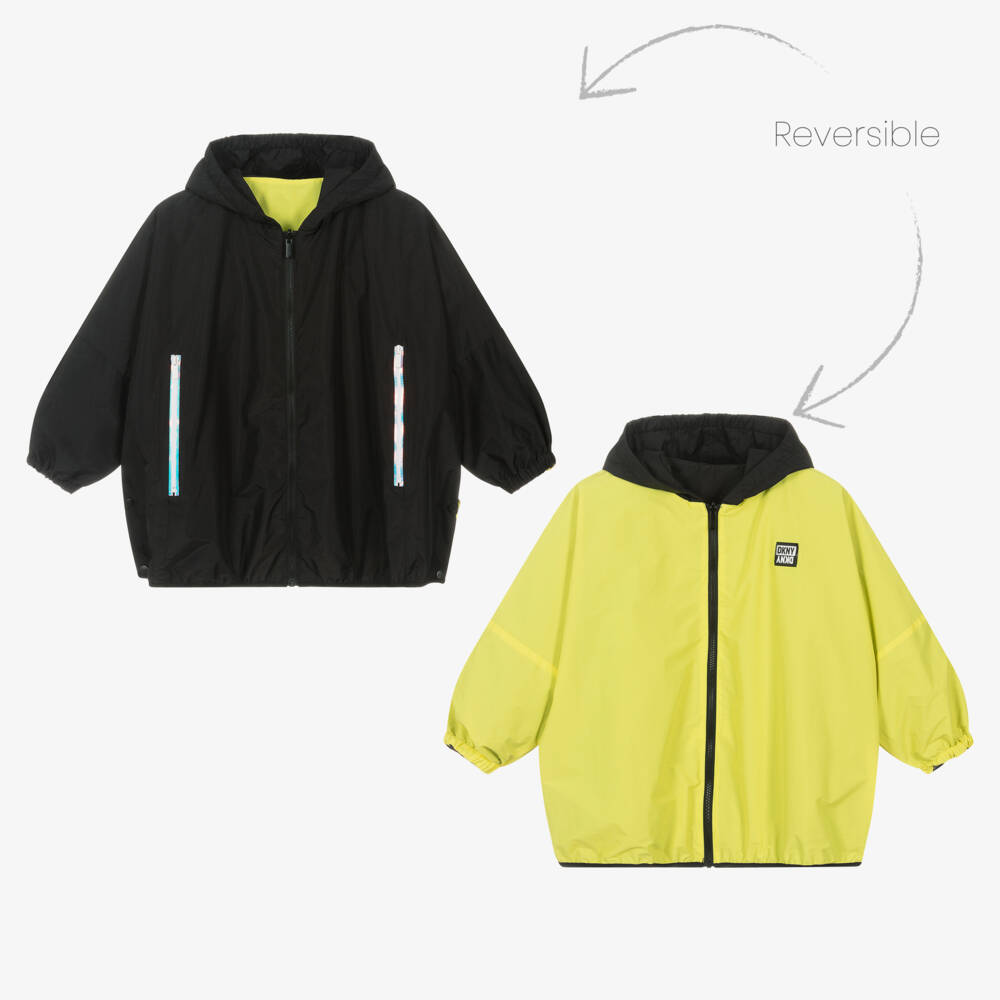 Black and lime green hooded windbreaker coat for teen girls by DKNY, in a versatile, reversible design. Made in silky smooth and lightweight fabric, the black side has exposed white zip pockets on the front and a silver iridescent logo print on the back. The reverse yellow side has a square black and white rubberised logo patch on the chest with a large statement logo graphic on the back. Oversized and wide-fitting with wide dropped sleeves and a zip front, the coat is finished with split side seams that fasten with branded popper fastenings.