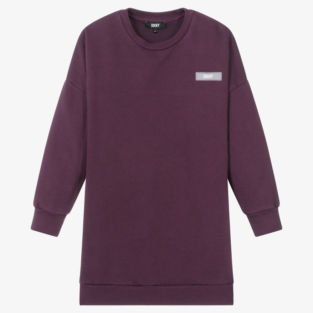 Purple dress for teen girls by DKNY, with a contrast purple logo printed across the back and back of the sleeves for a bold designer statement. This casual dress has cosy ribbed trims, concealed side seam pockets and a white rubberised logo on the chest for a subtle designer finish. It is made in soft, mid-weight sweatshirt jersey.