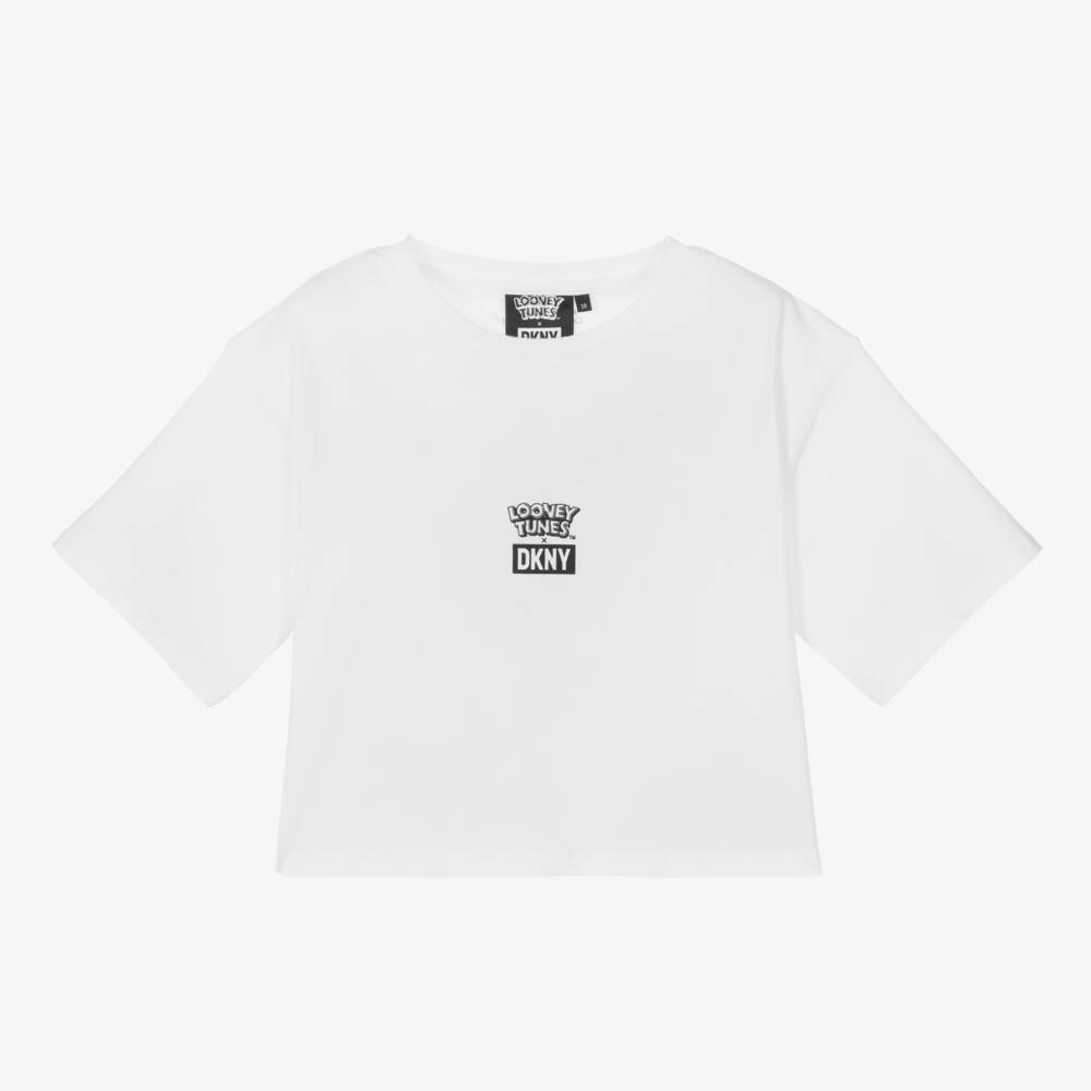 Cool white cropped T-shirt for teen girls by DKNY, with an oversized Sylvester character print on the back. This cartoon-inspired tee has a black logo print on the front, marking the collaboration with Looney Tunes, and 'That's All Folks!', an iconic phrase from the cartoon behind the neck. Fun and comfortable at the same time, this boxy-fit top is made in cotton jersey.