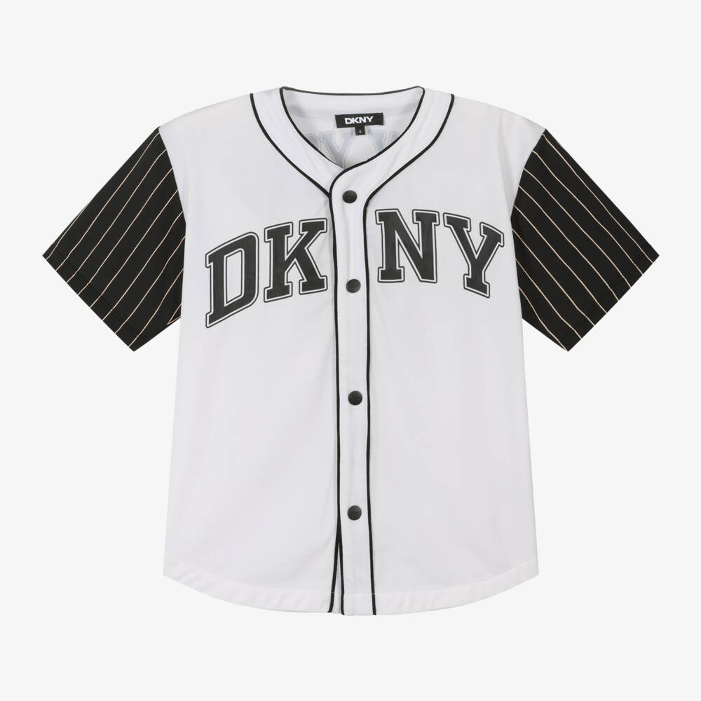 A cool and sporty white baseball shirt for boys and girls by DKNY, with black and white striped sleeves. Made in silky jersey with a loose fit, it has a bold logo across the front and 'New York 89' printed on the back. The piped placket fastens with branded poppers.