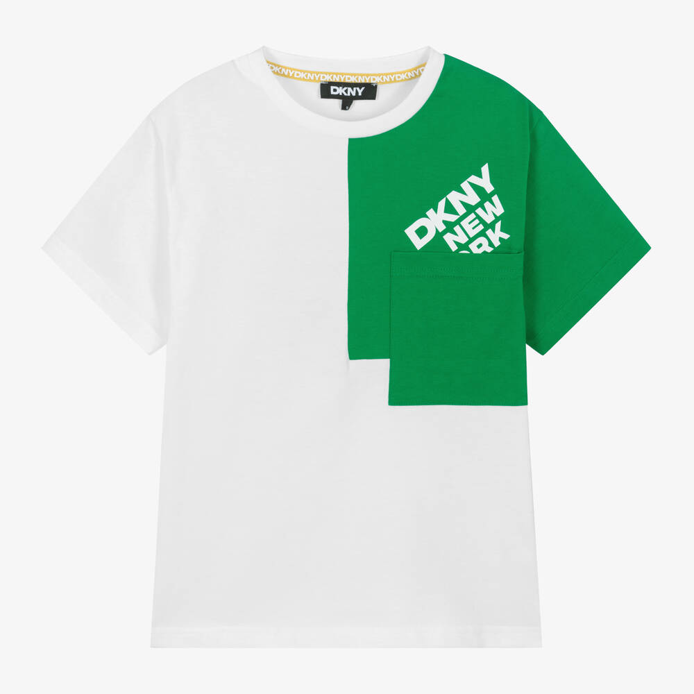 White organic cotton T-shirt for boys and girls by DKNY, with a green colourblock design. In a comfortable relaxed fit, this soft jersey top is casually styled with a crew neckline and chest patch pocket. A contrasting logo print adds instant designer appeal.