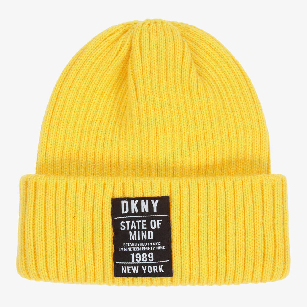 Yellow knitted beanie hat for girls by DKNY. Made from thick knitted acrylic, it has the brand's State of Mind embroidered logo patch on the front in black and white.