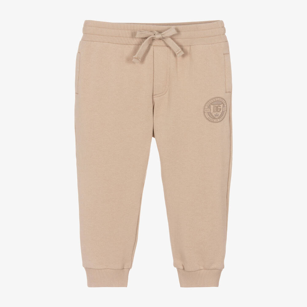 Beige cotton joggers for baby boys by Italian brand Dolce & Gabbana, with faux side pockets and a functioning back pocket. The designer's crest-style DG logo features on the front in tonal print, adding that all-important touch of luxury. These comfortable, cuffed joggers are made in soft, mid-weight jersey and designed with an elasticated, drawstring waist for no-fuss changing.