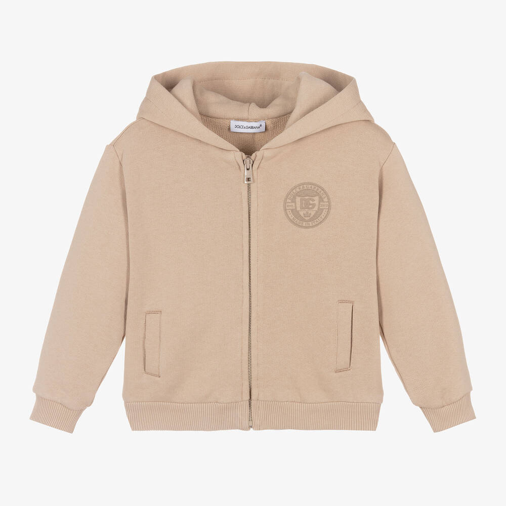Beige zip-up top for baby boys by luxury fashion designer Dolce & Gabbana, with faux pockets. In consideration of delicate skin, this long-sleeved layer is made in soft, mid-weight cotton jersey. The brand's crest-style DG logo features on the front in tonal print, adding that all-important designer touch. The smooth front zip is engraved with branding and the hood is lined.