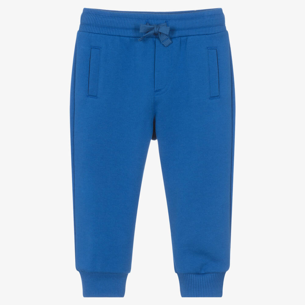 Royal blue joggers for baby boys by luxury Italian designer Dolce & Gabbana, made in a soft cotton jersey. These comfortable, cuffed joggers have a gently elasticated waistband with a drawstring tie and feature faux pockets on both the front and back. For a distinctive designer look, they have a metal logo plate on the back.