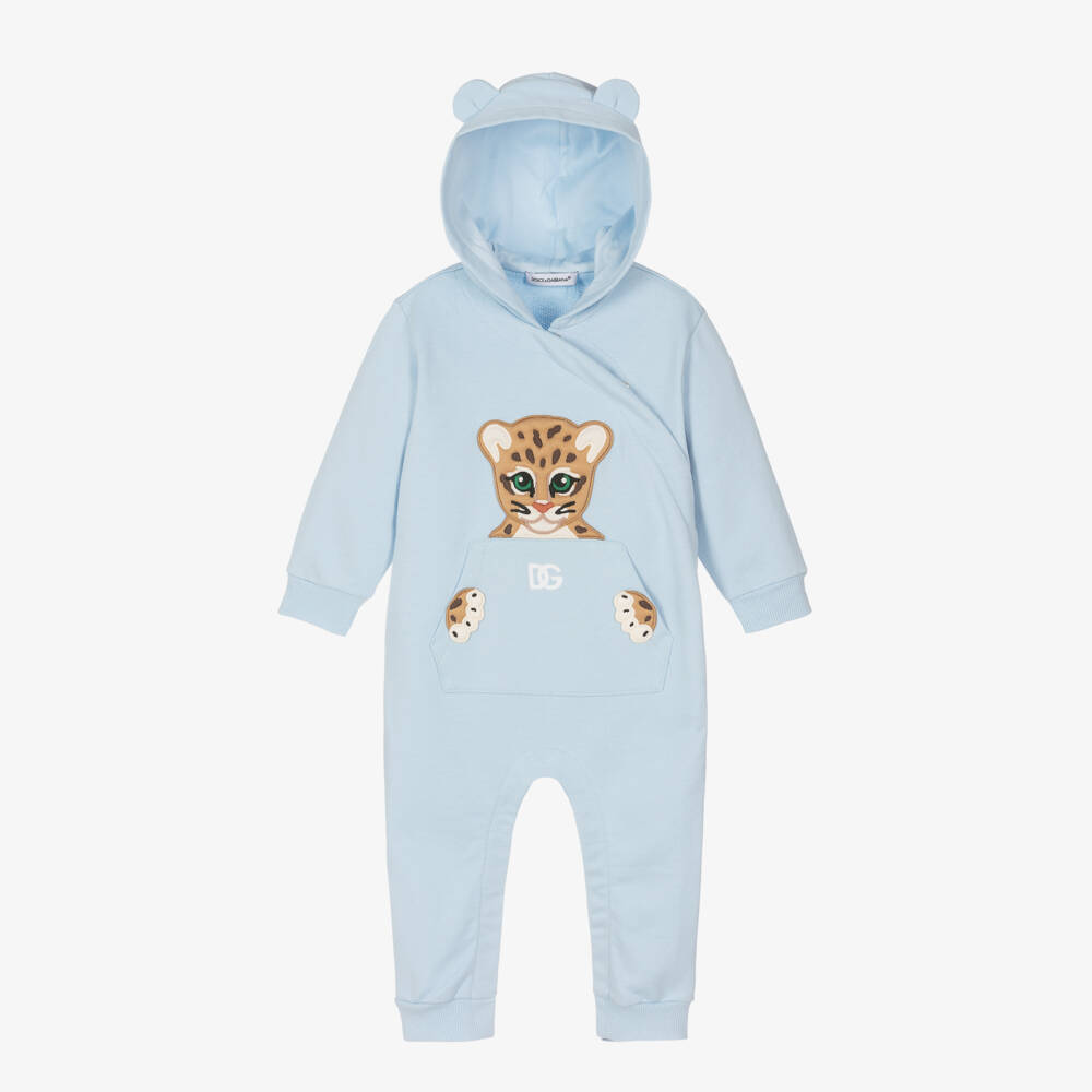Pale blue hooded romper for baby boys by Italian luxury designer Dolce & Gabbana, made in soft and comfortable cotton jersey. Gentle against delicate skin, it has stretchy ribbed trims for an extra cosy feel and fastens with easy-to-use poppers down the front and between the legs for quick dressing. It has a pouch pocket on the front, featuring a white embroidered crossover DG logo, with an adorable tiger cub appliqué above. Cute 3D ears on the hood give a sweet finish.