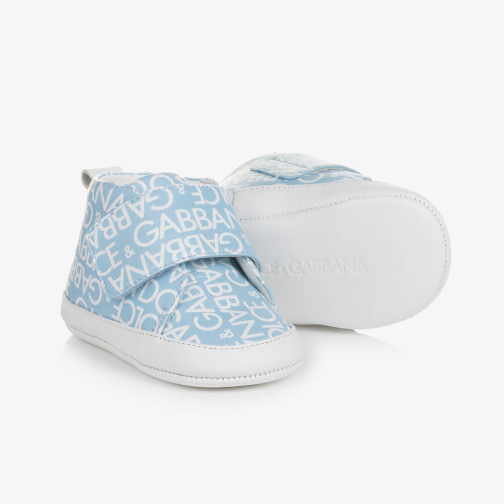 Baby boys pale blue and white pre-walker shoes by Italian designer Dolce & Gabbana, made in soft and supple nappa leather. These cute shoes are printed all over with the iconic designer's name and have an easy-to-use velcro fastening strap for a secure fit. Ideal for babies taking their first steps, they have a leather insole and a soft and flexible outer sole.