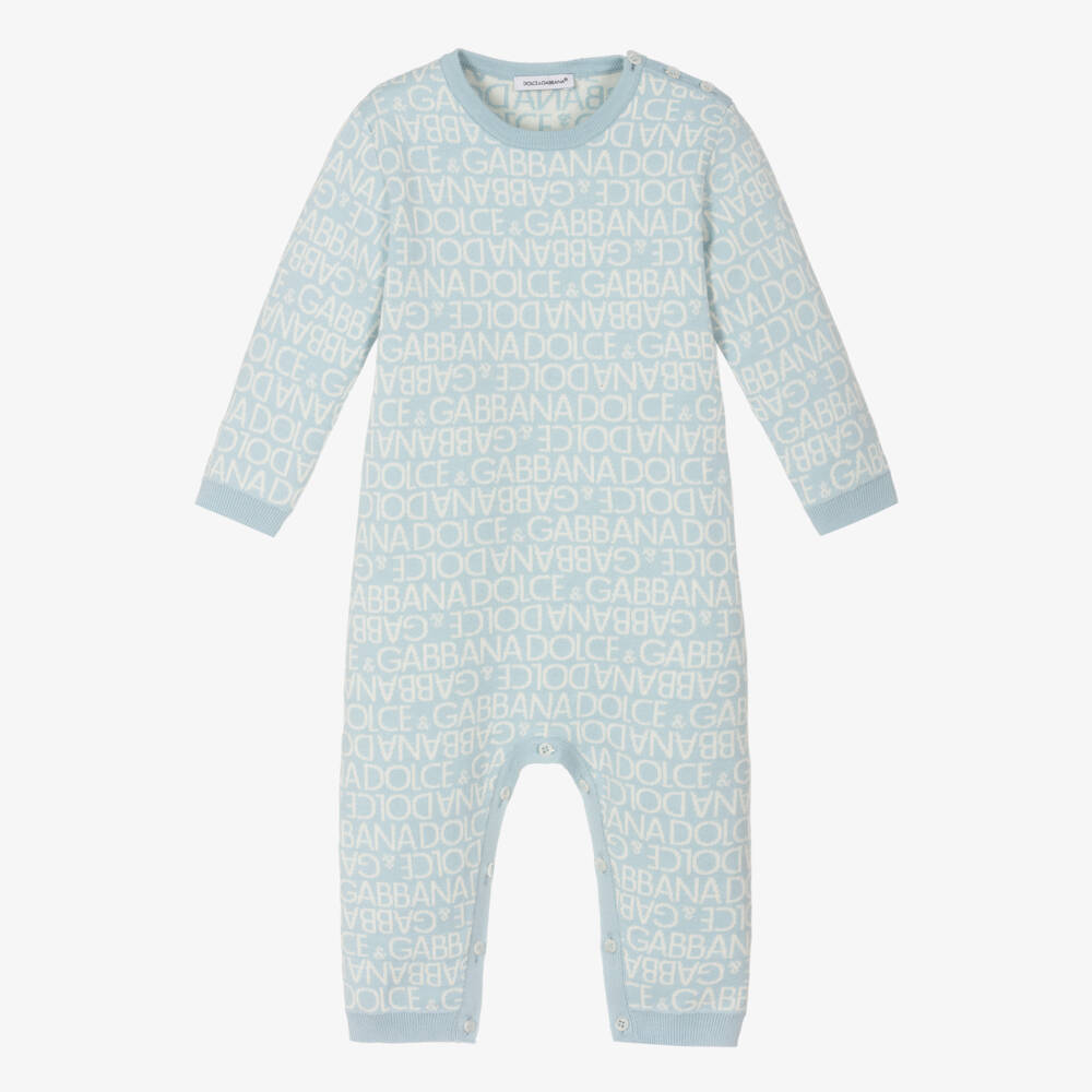 Lovely romper for baby boys by luxury Italian brand Dolce & Gabbana. Made in a soft cotton knit, it has a touch of cashmere for added luxury and warmth. It is patterned all over with white intarsia logos for distinctive designer appeal. It has cosy ribbed trims and fastens with buttons on one shoulder and between the legs.