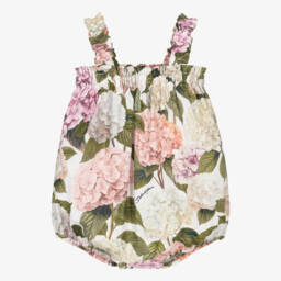 Ivory and beige shortie for baby boys by luxury Italian brand Dolce & Gabbana, made in soft and lightweight linen. Designed to look like a dungaree shorts and shirt set, this cute babysuit has slanted front pockets, short sleeves and faux shoulder straps. There are button and popper fastenings on the front and poppers between the legs to help with dressing and nappy changes. A beige embroidered logo on the hip adds a subtle designer finish.