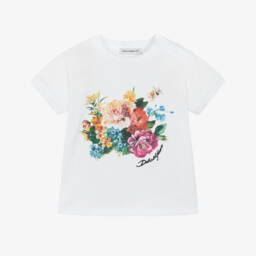 This Mini-me white cotton T-shirt for baby boys by Dolce & Gabbana features the luxury Italian brand's iconic Majolica pattern on the sleeve trims. It is made in soft jersey with neatly concealed poppers on one shoulder to help with dressing. This oversized tee has a DG logo printed on the matching chest pocket.