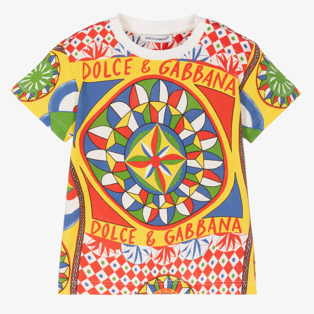 This red cotton T-shirt for baby boys is an unmistakable design by Italian label Dolce & Gabbana. Fun and vibrant, the soft and comfortable jersey fabric is signed with the iconic Carretto and logo print in yellow, blue and green. It fastens with poppers on one shoulder to help with over-the-head dressing.
