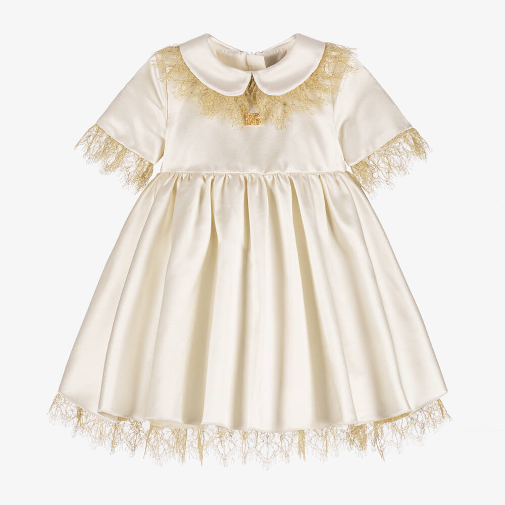 A luxurious ivory satin dress for baby girls by the Italian brand Dolce & Gabbana, made in a smooth silk blend. Ideal for any special occasion, it features a diamanté DG logo charm and beautiful gold lace with shimmering thread, adding a sparkly finish. There are matching silk knickers and fastens with a zip on the back.