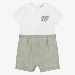 Beautiful shortie for baby girls by luxury Italian fashion house Dolce & Gabbana, made in soft, lightweight cotton poplin. Making an eye-catching statement, it features the designer's signature Majolica pattern in vibrant purple on a white background. Cool and comfortable, it has a shirred bodice and wide shoulder straps trimmed with pretty bows. It fastens with poppers between the legs for easy dressing.