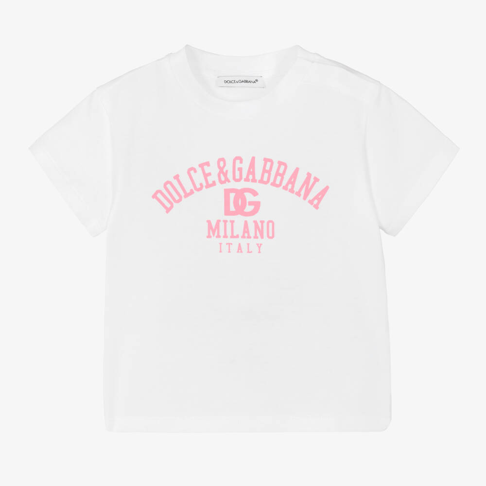 A white logo T-shirt for baby girls by luxury Italian brand Dolce & Gabbana, made in soft cotton jersey. This cool crew neck tee will elevate everyday casual look with the pink logo print on the front.