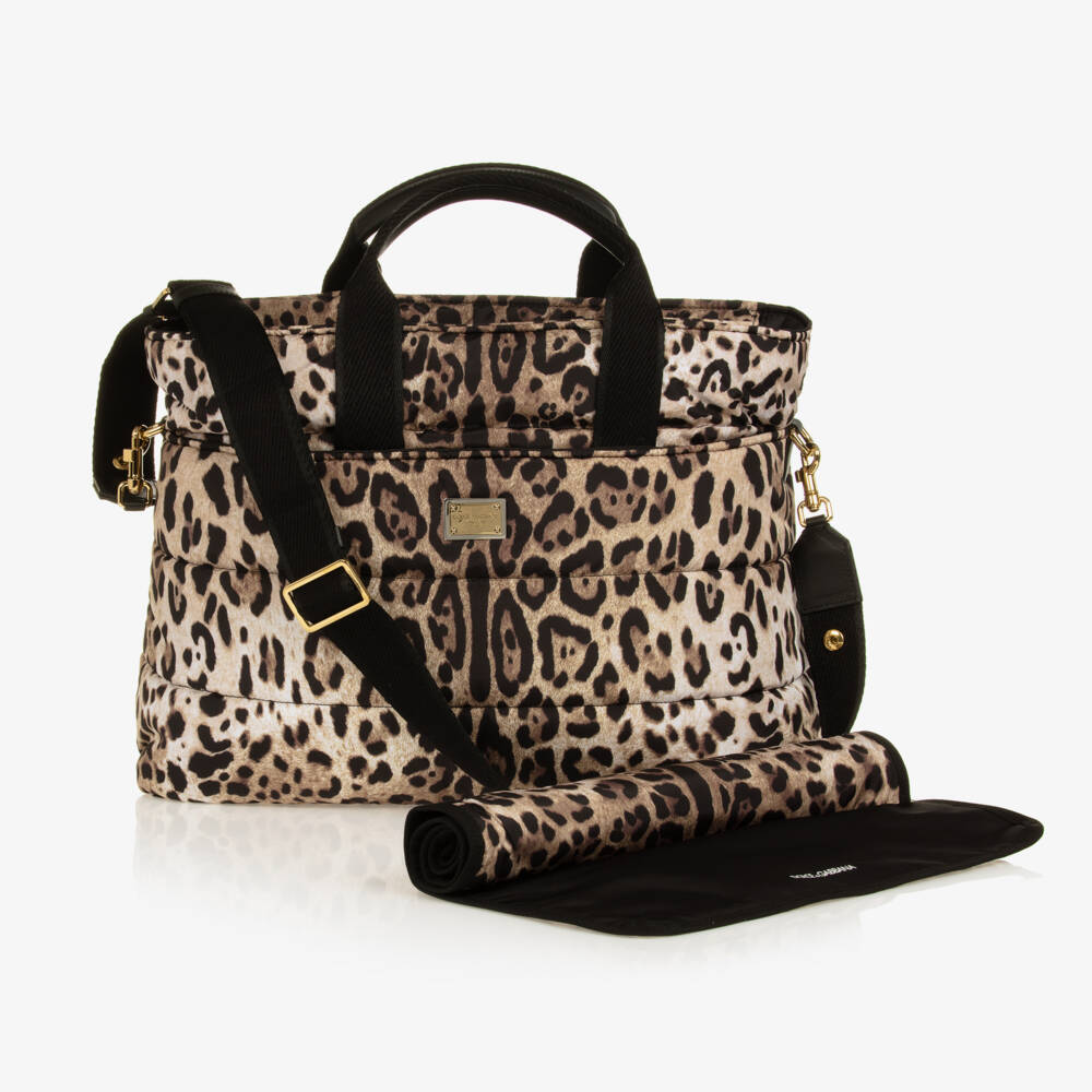 From luxury brand Dolce & Gabbana, beige and black leopard print changing bag with a metal logo tile on the front. Made in durable nylon it has a large main compartment which fastens with a zip for added security, two pouch pockets on the outside and three smaller internal pockets for easy organisation. It has carry handles and an adjustable, detachable shoulder strap for easier use. For added convenience, it comes with a matching changing mat.