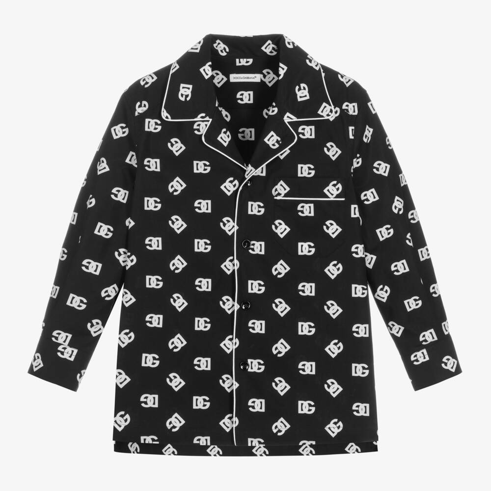 Boys and girls sleek black shirt by luxury brand Dolce & Gabbana, crafted in Italy. An icon of the designer, the soft cotton poplin material is signed with white Crossover DG branding. The bowling-style collar, button placket and chest pocket are trimmed with white piping to complement the monochrome design.