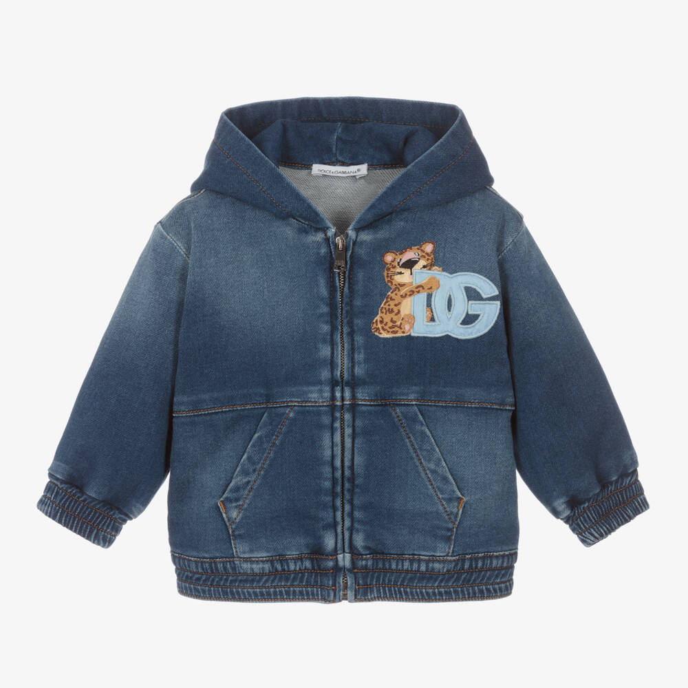 Mid-blue wash denim jacket for baby boys and girls from Italian luxury brand Dolce & Gabbana, in a slightly worn look. Fastening with a silver logo zip, this playful hooded piece has a crossover DG logo appliqué on the front with a cute leopard character. There are elasticated trims and handy pockets on the front.