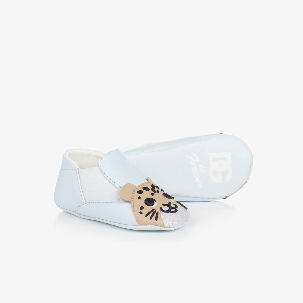 Pale blue pre-walkers for baby boys and girls from Italian designer Dolce & Gabbana, made in soft and supple leather. A friendly leopard appliqué with embroidered details can be seen on the front in beige and black. They are lined in soft leather with slightly padded insoles for ultimate comfort on little feet. There are elasticated panels on both sides allowing for easy slip-on and a secure fit. The flexible outsoles feature white DG branding for a signature finish.