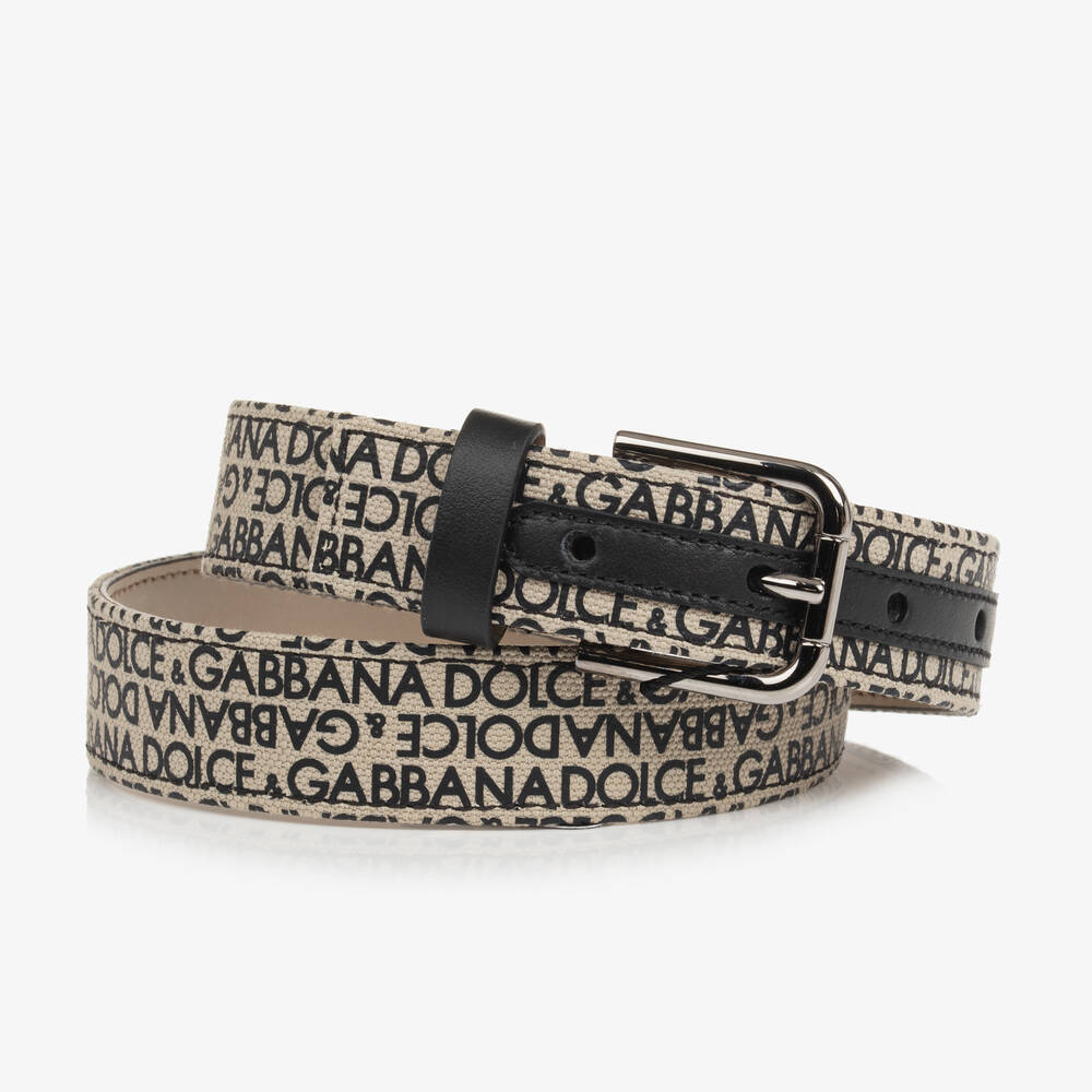 Light beige canvas belt for boys by luxury designer Dolce & Gabbana, detailed with black leather trims. Instantly recognisable, this Italian-made accessory is woven with cotton fabric and printed with black logo lettering for distinctive style. It has an adjustable pin buckle in silver hardware and a black belt loop stop.