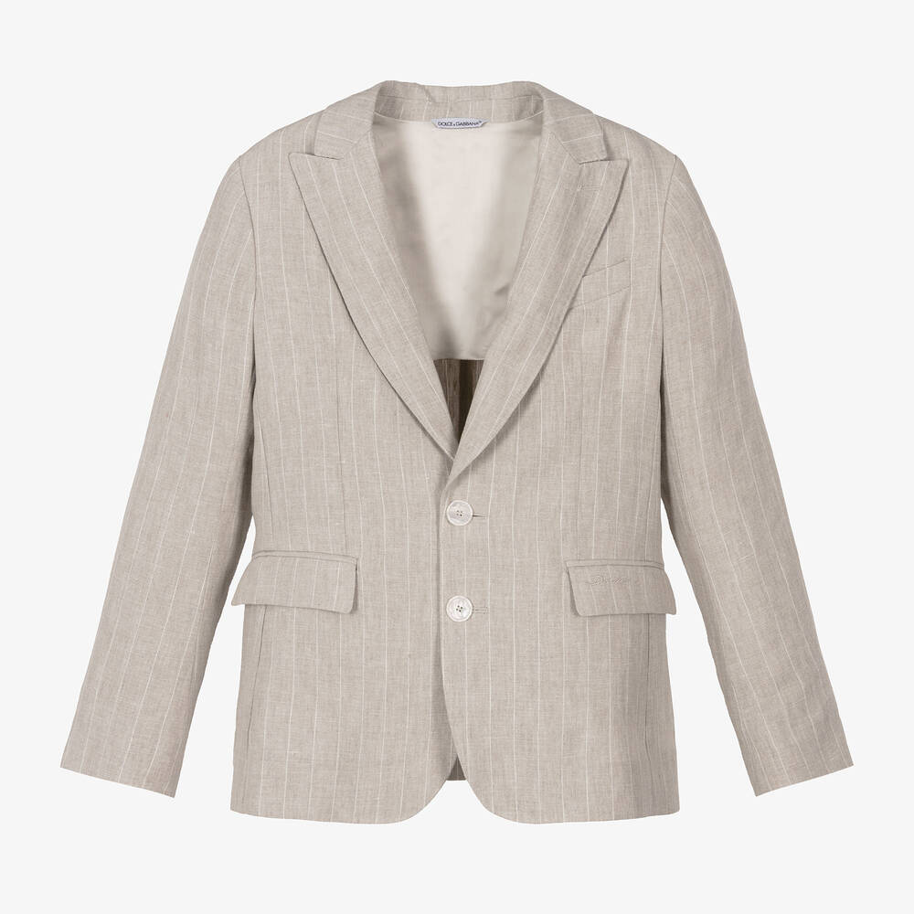 A stylish beige and white stripe blazer for boys by Dolce & Gabbana. It is inspired by the luxury Italian designer's main collection and is made in cool, lightweight linen. Ideal for smarter occasions, this single-breasted jacket has peaked lapels, a breast pocket and front flap pockets with an embroidered tonal logo on one side. It is a comfortable style for warmer days with a partial viscose satin lining, a single vent for ease of movement and decorative buttons on the cuffs.