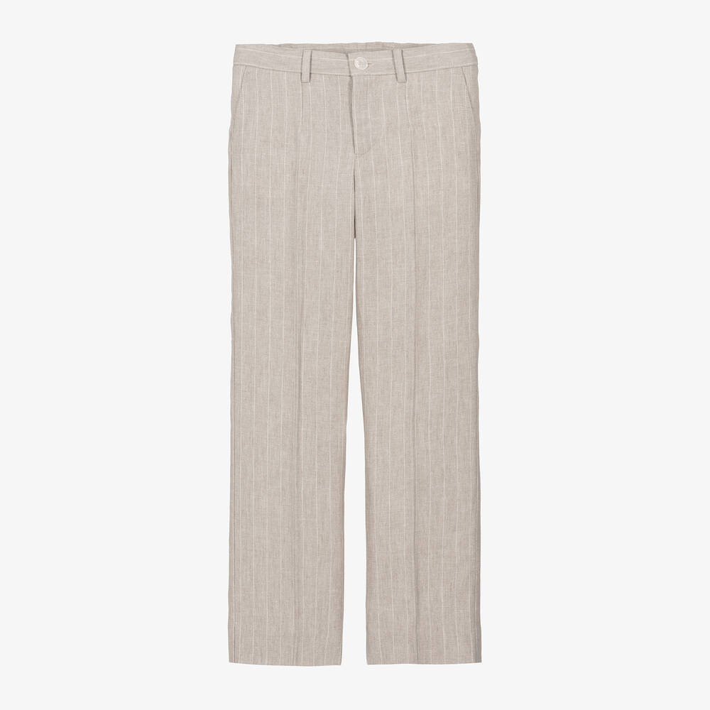 Beige and white striped linen trousers for boys by luxury Italian label Dolce & Gabbana. They are made from soft linen, cool and comfortable as a smart option for warmer days. They have slanted front pockets and welt back pockets with a discreet logo on one side in tonal embroidery. Fastening with a zip and button, the fit can be altered with the adjustable inner waistband.