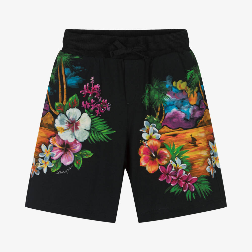 Full of imagination, these black shorts for boys are by luxury Italian designer Dolce & Gabbana. Made in soft cotton piqué, bold colours and shapes come together to create beautiful sunset landscapes on the legs. The designer name, signed below in white, along with vibrant white and pink flowers and green palm trees add to the design, creating a true Hawaiian feel. The classic style includes concealed pockets on the hips, a single pocket on the back and a drawstring waist for an adjustable fit.