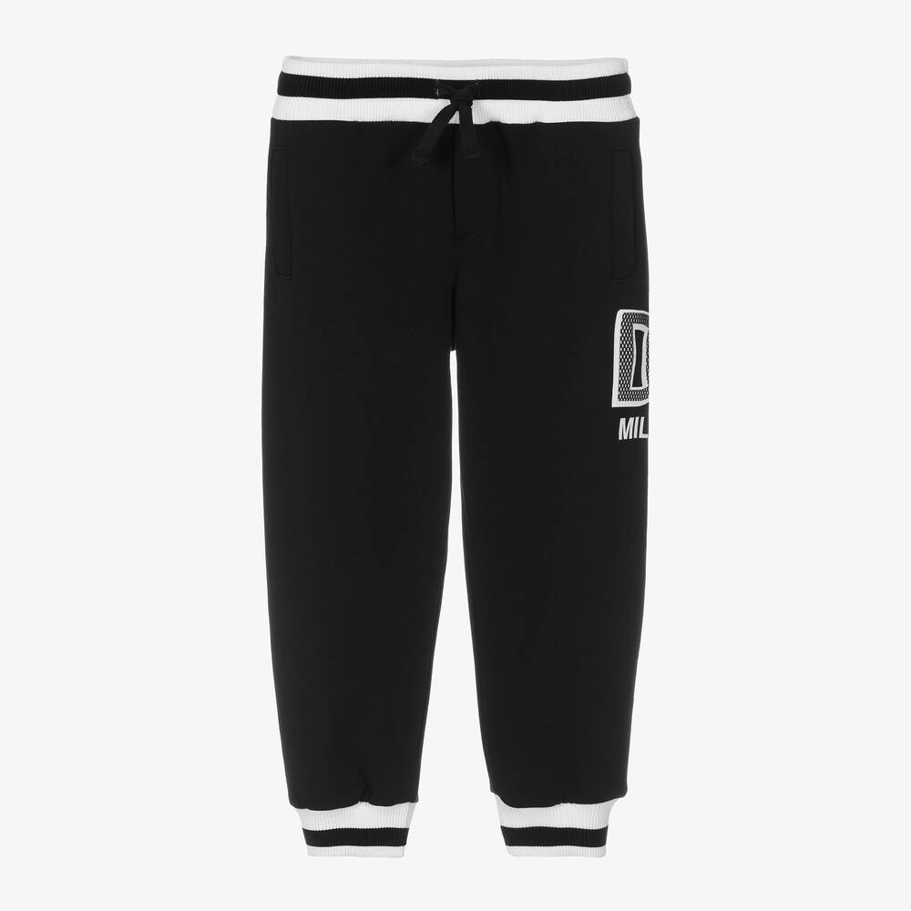Boys black cotton joggers by luxury brand Dolce & Gabbana, made in comfortable mid-weight jersey. Casual yet stylish, they have sporty white striped trims and a mesh Crossover DG Milano logo on one leg. There is an elasticated drawstring waistband for a great fit, ribbed cuffs and useful side and back pockets.