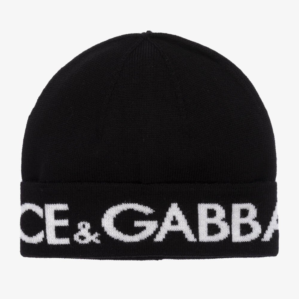 Black beanie hat for boys unmistakably by luxury Italian designer Dolce & Gabbana, with a bold, white intarsia logo all around the turned up brim. This cool hat is knitted in virgin wool for comfort and warmth.