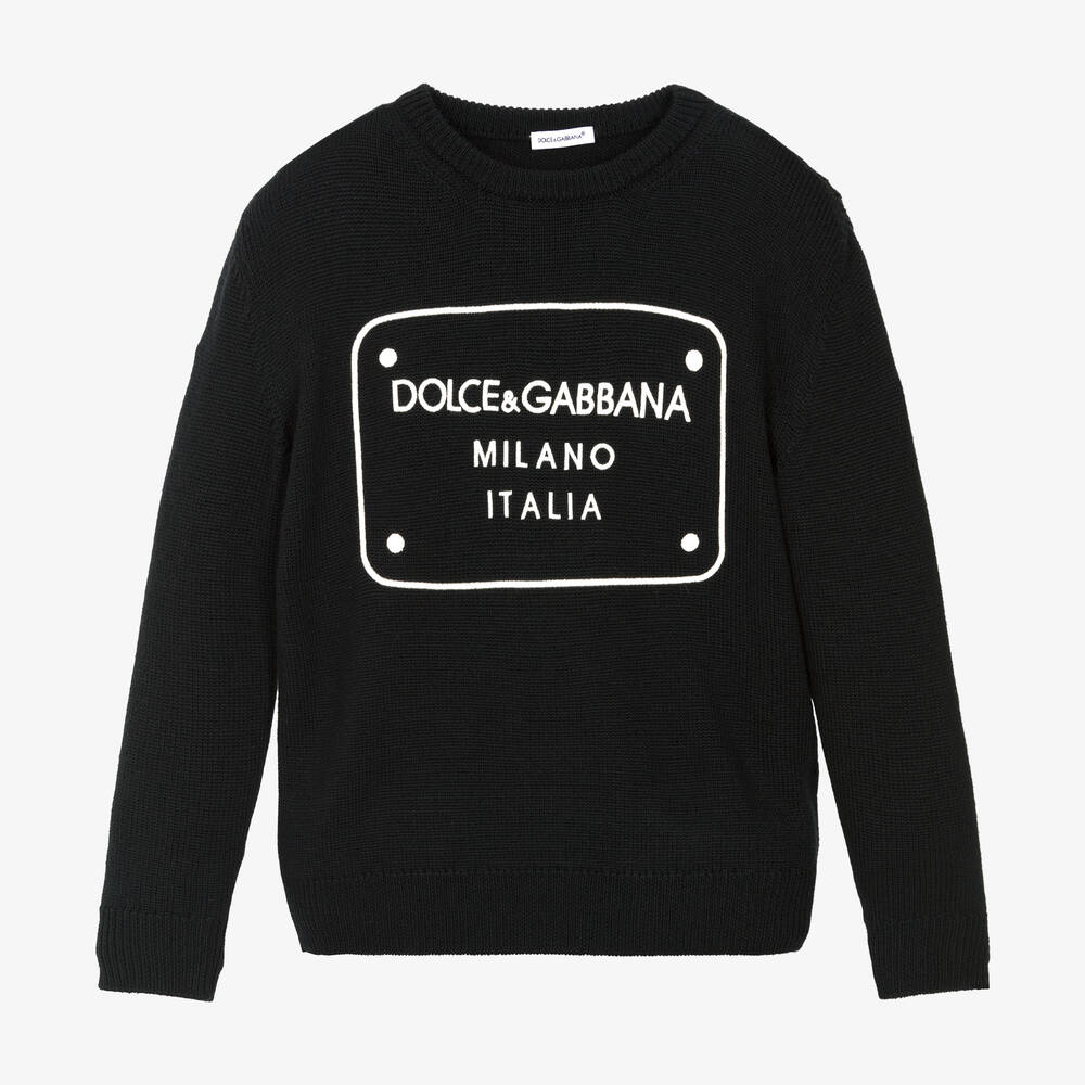 Black sweater for boys by luxury Italian fashion house Dolce & Gabbana. For a distinctive designer look, it has a bold white embroidered logo on the front. Cosy and comfortable, this long-sleeved top is softly knitted in pure virgin wool, with ribbed trims.
