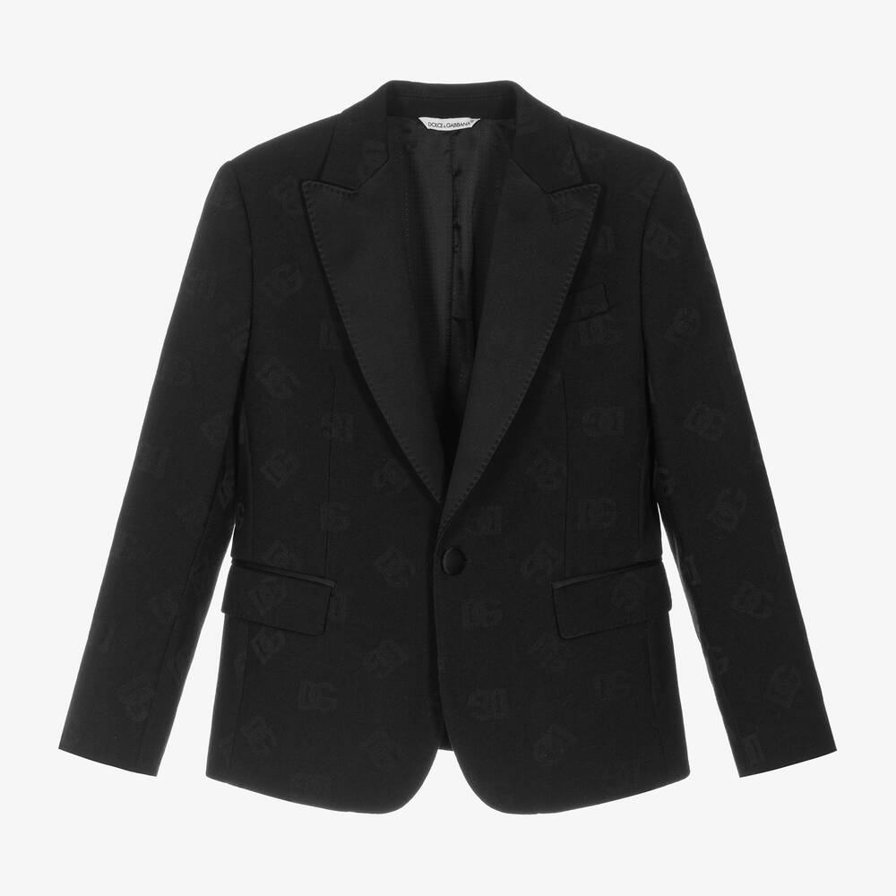 Super smart single-breasted black tuxedo jacket for boys by luxury Italian brand Dolce & Gabbana, ideal for special occasions. Made in a soft, wool blend twill, it has a jacquard DG logo pattern for instant designer appeal. There are satin lapels with matching piping on the front flap pockets, a satin-covered button fastening on the front and coordinating decorative buttons on the cuffs. The jacket has a vented back allowing freedom of movement and a lightweight satin lining.