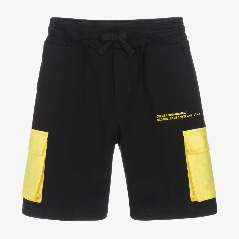 Black and yellow shorts for boys by luxury designer Dolce & Gabbana, made in soft cotton sweatshirt jersey. Printed with a contemporary logo on one leg in yellow, they come with stylish utility pockets on the sides for an urban look. Inspired by the designer's Gamer theme, these relaxed shorts feature a subtle grid design on the velcro pockets for a practical fit.