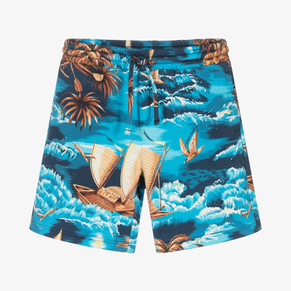 Bold blue shorts for boys by Italian luxury brand Dolce & Gabbana, made in mid-weight cotton jersey. Intense shapes and colours come together to create an ocean scene featuring large waves, sailboats, palm trees and birds. The designer name is signed in black on the thigh, lending a signature touch. Side seam pockets and a drawstring waist add to the design for a casual and comfortable fit.