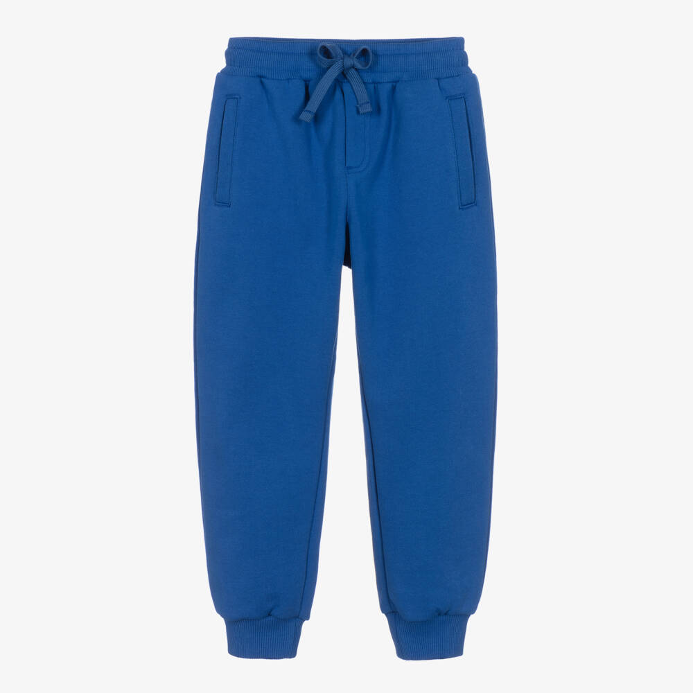 Blue Mini-me joggers for boys by Italian designer Dolce & Gabbana, made from super soft cotton jersey. These cuffed joggers have casual front pockets and a silver metal logo badge on the back for signature branded styling. A drawstring fastening finishes the waist for comfort.