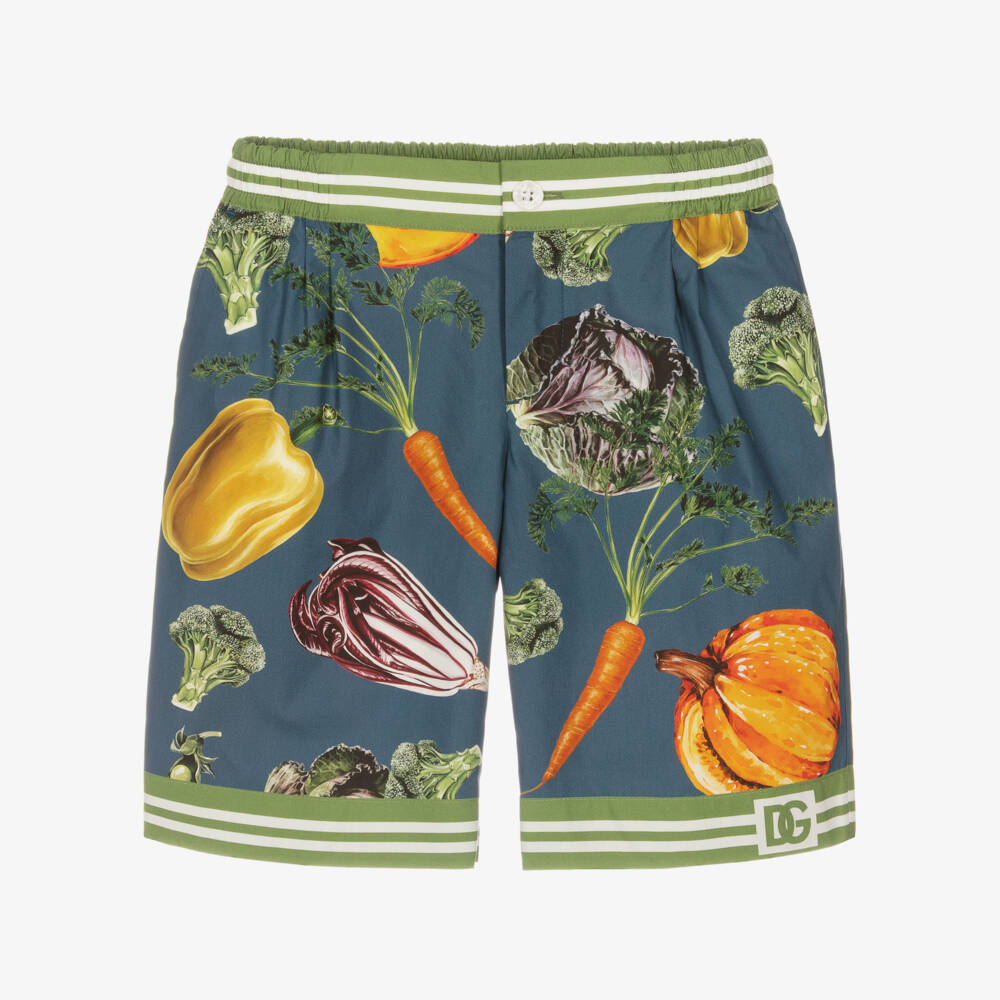 Blue cotton shorts for boys by luxury fashion House Dolce & Gabbana, inspired by a colourful Sicilian garden. Patterned with intricate paintings of vibrant vegetables, these quirky shorts are decorated with a sporty green and white stripe around the hems. The famous crossover DG logo stamps this smart-casual item near the hem, offering an instant designer upgrade. This Bermuda style has a part-elasticated waist and they fasten with a discreet button and zip.