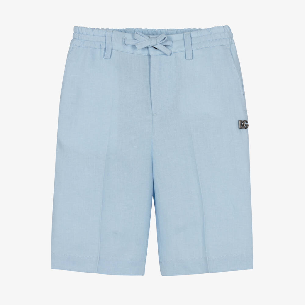 Smart casual Bermuda shorts for boys by Dolce & Gabbana, in luxuriously soft and lightweight light blue linen. They have a metal DG logo in a shiny gunmetal silver finish by the side seam for an elevated warm-weather casual look. They are traditionally styled with two slanted front pockets and two back pockets. Fastening with a zip and button, they have an elasticated waist with a drawstring for a custom fit.