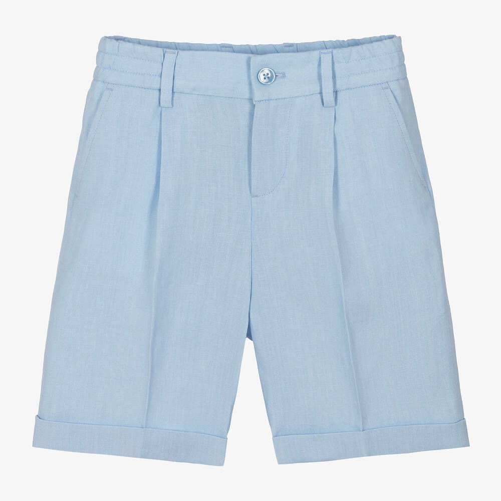 Pale blue Bermuda shorts for boys by luxury Italian label Dolce & Gabbana, made from soft and lightweight linen. This smart-casual tailored style has slanted front pockets and welt back pockets with a discreet logo on one side in tonal embroidery. Pleated at the front, they have smart turn-up cuffs and fasten with a zip and button. The waistband is elasticated for a comfortable fit.